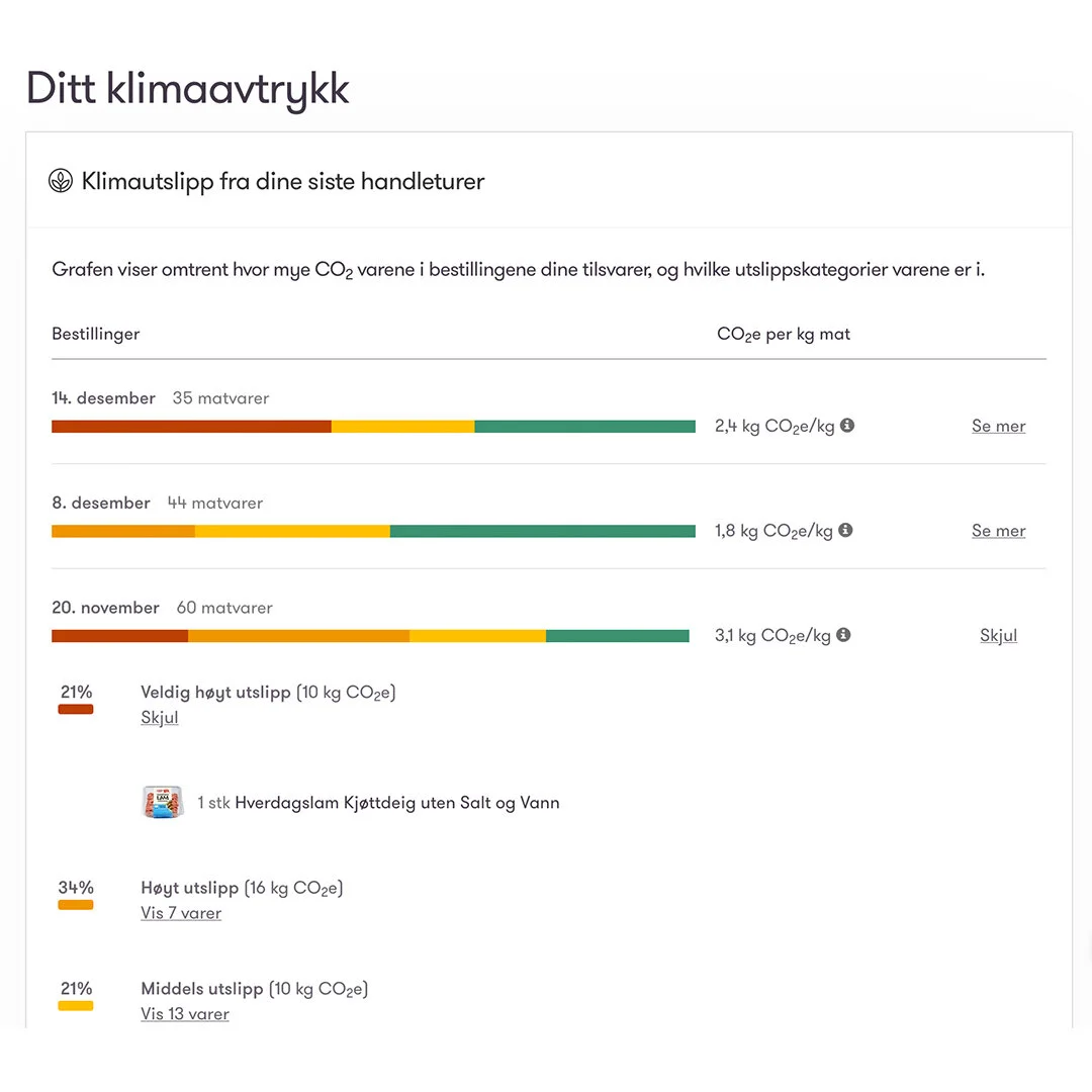 I Oda er vi så heldige å ha mange kunder som er opptatt av klima. Derfor laget vi i 2022 en oversikt over utslippene fra varene i handlekurven din. Vi håper du synes den er enkel og nyttig, selv i en hektisk hverdag! Her kan du lese mer om hvordan den fungerer og hvordan vi har laget den.