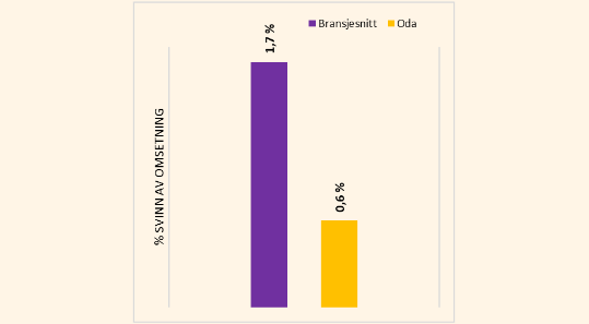 Matsvinnet i Norge skal halveres innen 2030. I Oda har vi kortet ned veien fra bonden til matbordet. Det gjør at vi kan levere ferskere mat, og også redusere svinn. Når du handler hos oss, forutser systemene våre nøyaktig hva slags varer vi trenger når. Det gir deg billigere og bedre mat, og vi slipper å sitte igjen med store mengder mat som ikke blir solgt. Mat vi svinner men som fortsatt kan selges samarbeider vi med Havaristen om og de selger produktene til redusert pris. Spiselig mat som av en eller annen grunn ikke kan selges, donerer vi til Matsentralen.